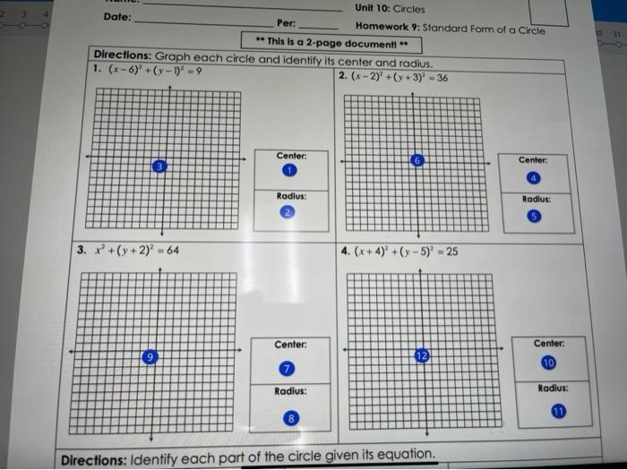 Given the equation of the circle, identify the center and radius or diameter. Circles homework 10 equations of circles answer key general.